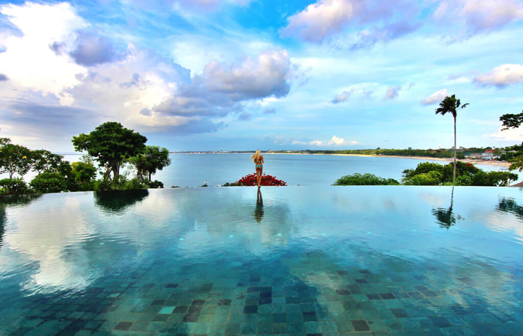 Alex (R) in our Blue Dream Visionary Swimsuit, with friend Allie (@alliemichellel) in our Saraswati V-Cut Swimsuit while traveling in Bali