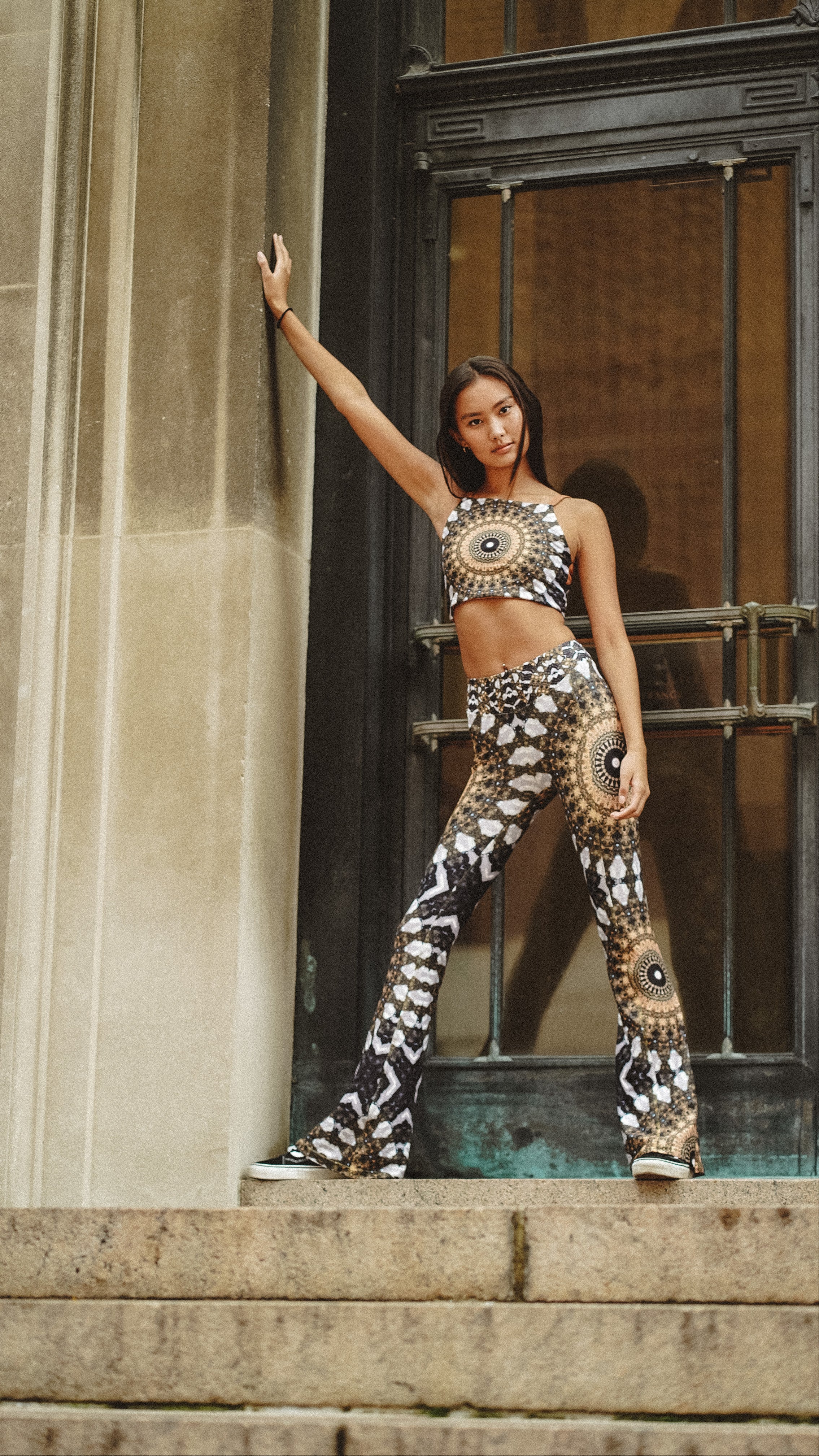 The Noor Print is made for the golden goddess. Get ready to step into the spotlight in these sunset-inspired golden hues. Pairs well with the Noor Reversible Four-Way Top.