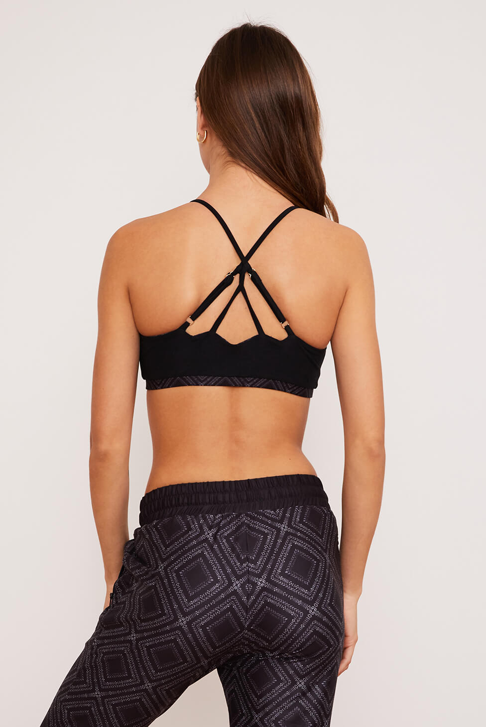 Versatility, comfort, femininity — this triple-threat bralette features sexy crisscross detailing, adjustable straps, and reverses from print to solid black. Made using post-consumer recycled plastic — 84% RPET and 16% spandex.